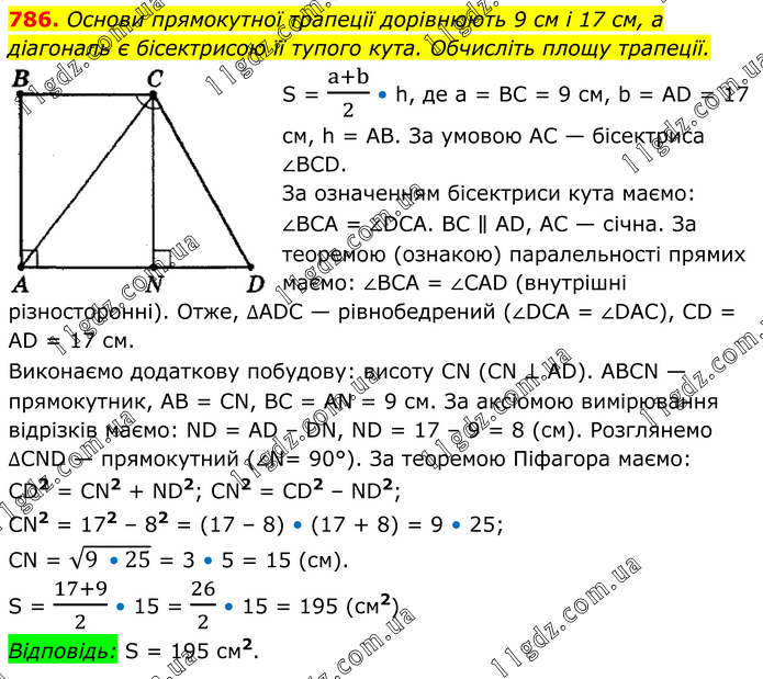 Основи прямокутної трапеції дорівнюють 9 см і 17 см, а діагональ є бісектрисою її тупого кута. Обчисліть площу трапеції. S = (a+b)/2 • h, де а = ВС = 9 см, b = AD = 17 см, h = АВ. За умовою АС — бісектриса ∠ВСD. За означенням бісектриси кута маємо: ∠ВСА = ∠DСА. ВС ∥ АD, АС — січна. За теоремою (ознакою) паралельності прямих маємо: ∠ВСА = ∠САD (внутрішні різноcторонні). Отже, ∆АDС — рівнобедрений (∠DСА = ∠DАС), СD = АD = 17 см. Виконаємо додаткову побудову: висоту СN (СN ⊥ АD). АВСN — прямокутник, АВ = СN, ВС = АN = 9 см. За аксіомою вимірювання відрізків маємо: ND = АD – DN, ND = 17 – 9 = 8 (см). Розглянемо ∆СND — прямокутний (∠N= 90°). За теоремою Піфагора маємо: СD2 = СN2 + ND2; СN2 = СD2 – ND2; CN2 = 172 – 82 = (17 – 8) • (17 + 8) = 9 • 25; СN = √(9 •25) = 3 • 5 = 15 (см). S = (17+9)/2 • 15 = 26/2 • 15 = 195 (см2) Відповідь: S = 195 см2.