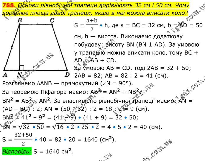 Основи рівнобічної трапеци дорівнюють 32 см і 50 см. Чому дорівнює площа даної трапеци, якщо в неї можна вписати коло? S = (a+b)/2 • h, де а = ВС = 32 см, b = АD = 50 см, h — висота. Виконаємо додаткову побудову: висоту ВN (ВN ⊥ АD). За умовою у трапецію можна вписати коло, тому ВС + АD = АВ + СD. За умовою АВ = СD, тоді 2АВ = 32 + 50; 2АВ = 82; АВ = 82 : 2 = 41 (см). Розглянемо ∆АNВ — прямокутний (∠N = 90°). За теоремою Піфагора маємо: АB2 = АN2 + NВ2; ВN2 = АВ2 – АN2. За властивістю рівнобічної трапеції маємо: АN = (АD – ВС) : 2; АN = (50 – 32) : 2 = 18 : 2 = 9 (см). ВN2 = 412 – 92 = (41 – 9) • (41 + 9) = 32 • 50; ВN = √(32 •50) = √(16 •2 •25 •2) = 4 • 5 • 2 = 40 (см). S = (32+50)/2 • 40 = 82 • 20 = 1640 (см2). Відповідь: S = 1640 см2.