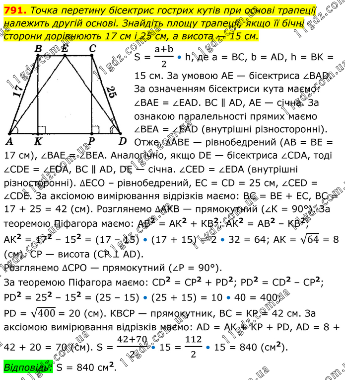 Точка перетину бісектрис гострих кутів при основі трапеції належить другій основі. Знайдіть площу трапеції, якщо її бічні сторони дорівнюють 17 см і 25 см, а висота — 15 см. S = (a+b)/2 • h, де а = ВС, b = AD, h = ВK = 15 см. За умовою АЕ — бісектриса ∠ВАD. За означенням бісектриси кута маємо: ∠ВАЕ = ∠ЕАD. ВС ∥ АD, АЕ — січна. За ознакою паралельності прямих маємо ∠ВЕА = ∠ЕАD (внутрішні різноcторонні). Отже, ∆АВЕ — рівнобедрений (АВ = ВЕ = 17 см), ∠ВАЕ = ∠ВЕА. Аналогічно, якщо DЕ — бісектриса ∠СDА, тоді ∠СDЕ = ∠ЕDА, ВС ∥ AD, DЕ — січна. ∠СЕD = ∠ЕDА (внутрішні різноcторонні). ∆ЕСО – рівнобедрений, ЕС = СD = 25 см, ∠СЕD = ∠CDЕ. За аксіомою вимірювання відрізків маємо: ВС = ВЕ + ЕС, ВС = 17 + 25 = 42 (см). Розглянемо ∆АКВ — прямокутний (∠К = 90°). За теоремою Піфагора маємо: АВ2 = АК2 + КВ2; АК2 = АВ2 – КВ2; АК2 = 172 – 152 = (17 – 15) • (17 + 15) = 2 • 32 = 64; АК = √64 = 8 (см). СР — висота (СР ⊥ АD). Розглянемо ∆СРО — прямокутний (∠Р = 90°). За теоремою Піфагора маємо: СD2 = СР2 + РD2; РD2 = СD2 – СР2; РD2 = 252 – 152 = (25 – 15) • (25 + 15) = 10 • 40 = 400; РD = √400 = 20 (см). КВСР — прямокутник, ВС = КР = 42 см. За аксіомою вимірювання відрізків маємо: АD = АК + КР + РD, АD = 8 + 42 + 20 = 70 (см). S = (42+70)/2 • 15 = 112/2 • 15 = 840 (см2). Відповідь: S = 840 см2.