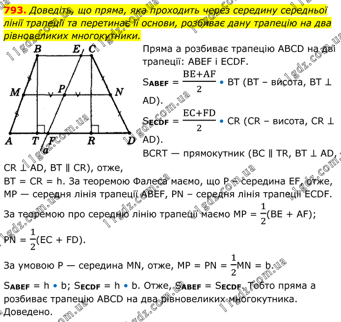 Доведіть, що пряма, яка проходить через середину середньої лінії трапеції та перетинає її основи, розбиває дану трапецію на два рівновеликих многокутники. Пряма а розбиває трапецію АВСD на дві трапеції: АВЕF і EСDF. SABEF = (BE+AF)/2 • BT (BT – висота, BT ⊥ AD). SECDF = (EC+FD)/2 • CR (CR – висота, CR ⊥ AD). ВСRТ — прямокутник (ВС ∥ ТR, ВТ ⊥ АD, СR ⊥ АD, ВT ∥ СR), отже, ВТ = СR = h. За теоремою Фалеcа маємо, що Р – середина ЕF, отже, МР — середня лінія трапеції АВЕF, РN – середня лінія трапеції ЕСDF. За теоремою про середню лінію трапеції маємо МР = 1/2(ВЕ + АF); PN = 1/2(ЕС + FD). За умовою Р — середина МN, отже, МР = РN = 1/2МN = b. SABEF = h • b; SECDF = h • b. Отже, SABEF = SECDF. Тобто пряма а розбиває трапецію ABCD на два рівновеликих многокутника. Доведено.