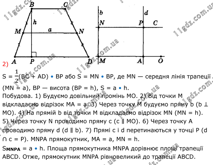 2) S = 1/2(ВС + АD) • ВР або S = МN • ВР, де МN — середня лінія трапеції (МN = а), ВР — висота (ВР = h), S = а • h. Побудова. 1) Будуємо довільний промінь МО. 2) Від точки М відкладаємо відрізок МА = а. 3) Через точку М будуємо пряму b (b ⊥ МО). 4) На прямій b від точки М відкладаємо відрізок MN (МN = h). 5) Через точку N проводимо пряму с (с ∥ МО). 6) Через точку А проводимо пряму d (d ∥ b). 7) Прямі с і d перетинаються у точці Р (d ∩ с = Р). МNРА прямокутник, МА = а, МN = h. SMNPA = а • h. Площа прямокутника МNРА дорівнює площі трапеції АВСD. Отже, прямокутник МNРА рівновеликий до трапеції АВСD.