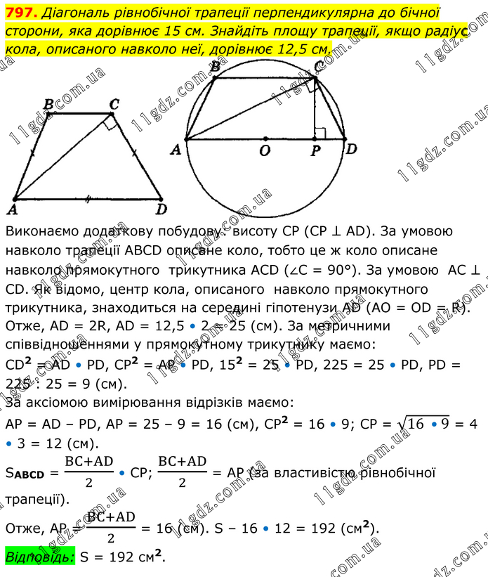 Діагональ рівнобічної трапеції перпендикулярна до бічної сторони, яка дорівнює 15 см. Знайдіть площу трапеції, якщо радіус кола, описаного навколо неї, дорівнює 12,5 см. Виконаємо додаткову побудову: висоту СР (СР ⊥ АD). За умовою навколо трапеції АВСD описане коло, тобто це ж коло описане навколо прямокутного трикутника АСD (∠С = 90°). За умовою АС ⊥ СD. Як відомо, центр кола, описаного навколо прямокутного трикутника, знаходиться на середині гіпотенузи АD (АО = ОD = R). Отже, АD = 2R, АD = 12,5 • 2 = 25 (см). За метричними співвідношеннями у прямокутному трикутнику маємо: СD2 = АD • РD, СР2 = АР • РD, 152 = 25 • РD, 225 = 25 • РD, РD = 225 : 25 = 9 (см). За аксіомою вимірювання відрізків маємо: АР = АD – РD, АР = 25 – 9 = 16 (см), СР2 = 16 • 9; СР = √(16 •9) = 4 • 3 = 12 (см). SABCD = (BC+AD)/2 • CP; (BC+AD)/2 = AP (за властивістю рівнобічної трапеції). Отже, AP = (BC+AD)/2 = 16 (см). S – 16 • 12 = 192 (см2). Відповідь: S = 192 см2.