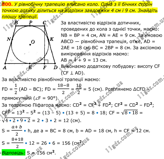 У рівнобічну трапецію вписано коло. Одна з її бічних сторін точкою дотику ділиться на відрізки завдовжки 4 см і 9 см. Знайдіть площу трапеції. За властивістю відрізків дотичних, проведених до кола з однієї точки, маємо: NВ = ВР = 4 см, AN = АЕ = 9 см. За умовою АВСD — рівнобічна трапеція, отже, АD = 2АЕ = 18 см, ВС = 2ВР = 8 см. За аксіомою вимірювання відрізків маємо: АВ = 4 + 9 = 13 см. Виконаємо додаткову побудову: висоту СF (СF ⊥ АD). За властивістю рівнобічної трапеції маємо: FD = 1/2 (АD – ВС); FD = (18-8)/2 = 10/2 = 5 (см). Розглянемо ∆СFD – прямокутний (∠F = 90°). За теоремою Піфагора маємо: СD2 = СF2 + FD2; СF2 = CD2 – FD2; CF2 = 132 – 52 = (13 – 5) • (13 + 5) = 8 • 18; СF = √(8•18) = √(4•2•9•2) = 2 • 3 • 2 = 12 (см). S = (a+ b)/2 • h, де а = ВС = 8 см, b = АD = 18 см, h = СF = 12 см. S = (8+18)/2 • 12 = 26 • 6 = 156 (см2). Відповідь: S = 156 см2.
