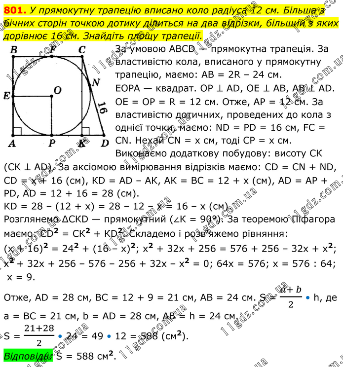 У прямокутну трапецію вписано коло радіуса 12 см. Більша з бічних сторін точкою дотику ділиться на два відрізки, більший з яких дорівнює 16 см. Знайдіть площу трапеції. За умовою АВСD — прямокутна трапеція. За властивістю кола, вписаного у прямокутну трапецію, маємо: АВ = 2R – 24 см. ЕОРА — квадрат. ОР ⊥ АD, ОЕ ⊥ АВ, АВ ⊥ АD. OE = ОР = R = 12 см. Отже, АР = 12 см. За властивістю дотичних, проведених до кола з однієї точки, маємо: ND = РD = 16 см, FС = СN. Нехай СN = x см, тоді СР = х см. Виконаємо додаткову побудову: висоту СК (СК ⊥ АD). За аксіомою вимірювання відрізків маємо: СD = СN + ND, СD = x + 16 (см), КD = АD – АК, АК = ВС = 12 + х (см), АD = АР + РD, АD = 12 + 16 = 28 (см). КD = 28 – (12 + х) = 28 – 12 – x = 16 – x (см). Розглянемо ∆СКD — прямокутний (∠К = 90°). За теоремою Піфагора маємо: СD2 = СК2 + КD2. Складемо і розв’яжемо рівняння: (х + 16)2 = 242 + (16 – х)2; х2 + 32x + 256 = 576 + 256 – 32x + х2; x2 + 32х + 256 – 576 – 256 + 32х – x2 = 0; 64x = 576; x = 576 : 64; x = 9. Отже, АD = 28 см, ВС = 12 + 9 = 21 см, АВ = 24 см. S = (a+ b)/2 • h, де а = ВС = 21 см, b = AD = 28 см, АВ = h = 24 см. S = (21+28)/2 • 24 = 49 • 12 = 588 (см2). Відповідь: S = 588 см2.