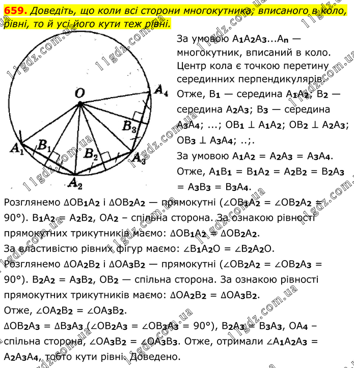 Доведіть, що коли всі сторони многокутника, вписаного в коло, рівні, то й усі його кути теж рівні. За умовою А1А2А3...Аn — многокутник, вписаний в коло. Центр кола є точкою перетину серединних перпендикулярів. Отже, В1 — середина А1А2; В2 — середина А2A3; В3 — середина А3А4; ...; ОВ1 ⊥ А1А2; ОВ2 ⊥ A2A3; ОВ3 ⊥ А3А4; ..;. За умовою А1А2 = А2А3 = A3A4. Отже, А1В1 = В1А2 = А2В2 = В2A3 = А3В3 = В3А4. Розглянемо ∆ОВ1А2 і ∆ОВ2А2 — прямокутні (∠ОВ1А2 = ∠OB2A2 = 90°). В1А2 = A2B2, OA2 – спільна сторона. За ознакою рівності прямокутних трикутників маємо: ∆ОВ1А2 = ∆ОВ2А2. За властивістю рівних фігур маємо: ∠В1А2O = ∠В2А2O. Розглянемо ∆ОА2В2 і ∆ОА3В2 — прямокутні (∠ОВ2А2 = ∠ОВ2А3 = 90°). В2А2 = А3В2, ОВ2 — спільна сторона. За ознакою рівності прямокутних трикутників маємо: ∆ОА2В2 = ∆ОА3В2. Отже, ∠ОА2В2 = ∠ОА3В2. ∆ОВ2А3 = ∆В3А3 (∠ОВ2A3 = ∠ОB3A3 = 90°), В2А3 = В3A3, ОА4 – спільна сторона, ∠ОА3В2 = ∠ОА3В3. Отже, отримали ∠А1А2А3 = А2А3А4, тобто кути рівні. Доведено.