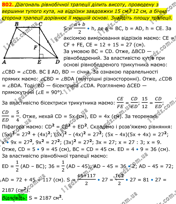 Діагональ рівнобічної трапеції ділить висоту, проведену з вершини тупого кута, на відрізки завдовжки 15 см і 12 см, а бічна сторона трапеції дорівнює її меншій основі. Знайдіть площу трапеції. S = (a+ b)/2 • h, де а = ВС, b = АD, h = СЕ. За аксіомою вимірювання відрізків маємо: СЕ = СF + FЕ, СЕ = 12 + 15 = 27 (см). За умовою ВС = СD. Отже, ∆ВСD — рівнобедрений. За властивістю кутів при основі рівнобедреного трикутника маємо: ∠CBD = ∠СDВ. ВС ∥ АD, ВD — січна. За ознакою паралельності прямих маємо: ∠СВD = ∠ВDА (внутрішні різносторонні). Отже, ∠СDВ = ∠ВDА. Тоді ВD — бісектриса ∠СDА. Розглянемо ∆СЕD — прямокутний (∠Е = 90°). За властивістю бісектриси трикутника маємо: CE/FE = CD/ED; 15/12 = CD/ED; CD/ED = 5/4. Отже, нехай СD = 5х (см), ЕD = 4х (см). За теоремою Піфагора маємо: СD2 = СЕ2 + ЕD2. Складемо і розв’яжемо рівняння: (5x)2 = 272 + (4х)2; (5х)2 – (4х)2 = 272; (5х – 4х)(5х + 4х) = 272; x • 9х = 272, 9х2 = 272; (Зх)2 = 272; Зх = 27; x = 27 : 3; x = 9. Отже, СD = 5 • 9 = 45 (см), ВС = СD = 45 см. ED = 4 • 9 = 36 (см). За властивістю рівнобічної трапеції маємо: ED = 1/2 (АD – ВС); 36 = 1/2 (AD – 45); AD – 45 = 36 • 2; AD – 45 = 72; AD = 72 + 45 = 117 (см). S = (45+117)/2 • 27 = 162/2 • 27 = 81 • 27 = 2187 (см2). Відповідь: S = 2187 cм2.