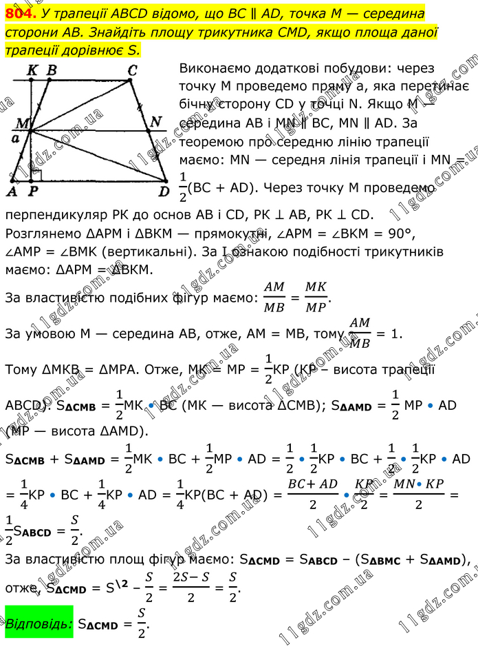 У трапеції ABCD відомо, що BC ∥ AD, точка M — середина сторони AB. Знайдіть площу трикутника CMD, якщо площа даної трапеції дорівнює S. Виконаємо додаткові побудови: через точку M проведемо пряму а, яка перетинає бічну сторону CD у точці N. Якщо M — середина АВ і MN ∥ ВС, MN ∥ AD. За теоремою про середню лінію трапеції маємо: MN — середня лінія трапеції і MN = 1/2(ВС + AD). Через точку M проведемо перпендикуляр РК до основ АВ і СD, РК ⊥ АВ, РК ⊥ СD. Розглянемо ∆АРМ і ∆ВКМ — прямокутні, ∠APM = ∠BKM = 90°, ∠AMP = ∠BMK (вертикальні). За І ознакою подібності трикутників маємо: ∆АРM = ∆ВКМ. За властивістю подібних фігур маємо: AM/MB = MK/MP. За умовою M — середина АВ, отже, АМ = МВ, тому AM/MB = 1. Тому ∆МКВ = ∆МРА. Отже, МК = МР = 1/2КР (КР – висота трапеції АВСD). S∆CMB = 1/2МК • ВС (МК — висота ∆СМВ); S∆AMD = 1/2 МР • АD (МР — висота ∆АМD). S∆CMB + S∆AMD = 1/2MK • BC + 1/2MP • AD = 1/2 • 1/2KP • BC + 1/2 • 1/2KP • АD = 1/4KP • BC + 1/4KP • AD = 1/4KP(BC + AD) = (BC+ AD)/2 • KP/2 = (MN• KP)/2 = 1/2SABCD = S/2. За властивістю площ фігур маємо: S∆CMD = SABCD – (S∆BMC + S∆AMD), отже, S∆CMD = S\2 – S/2 = (2S- S)/2 = S/2. Відповідь: S∆CMD = S/2.