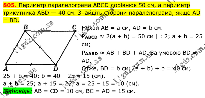 Периметр паралелограма ABCD дорівнює 50 см, а периметр трикутника ABD — 40 см. Знайдіть сторони паралелограма, якщо AD = BD. Нехай АВ = а см, АD = b см. PABCD ≈ 2(а + b) = 50 см | : 2; a + b = 25 см; Р∆ABD ≈ АВ + ВD + АD. За умовою ВD = АD. Отже, ВD = b см; (а + b) + b = 40 см; 25 + b = 40; b = 40 – 25 = 15 (см). а + b = 25; а + 15 = 25; а = 25 – 15 = 10 (см). Відповідь: АВ = СD = 10 см, ВС = АD = 15 см.