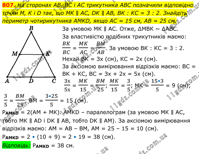 На сторонах AB, BC і AC трикутника ABC позначили відповідно точки M, K i D так, що MK ∥ AC, DK ∥ AB, BK : KC = 3 : 2. Знайдіть периметр чотирикутника AMKD, якщо AC = 15 см, AB = 25 см. За умовою МК ∥ АС. Отже, ∆МВК ~ ∆АВС. За властивістю подібних трикутників маємо: BK/BC = MK/AC = BM/AB. За умовою ВК : КС = 3 : 2. Нехай ВK = Зх (см), КС = 2х (см). За аксіомою вимірювання відрізків маємо: ВС = ВK + KС, ВС = Зx + 2х = 5х (см). 3х/5х = MK/15 = BM/25; MK/15 = 3/5; MK = (15•3)/5 = 9 (см); 3/5 = BM/25; ВМ = (3•25)/5 = 15 (см). PAMKD = 2(AM + MK). AMKD – паралелограм (за умовою МК ∥ АС, тобто МК ∥ AD і DK ∥ AB, тобто DK ∥ AM). За аксіомою вимірювання відрізків маємо: AM = AB – BM, AM = 25 – 15 = 10 (см). PAMKD = 2 • (10 + 9) = 2 • 19 = 38 (см). Відповідь: PAMKD = 38 см.