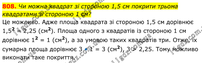 Чи можна квадрат зі стороною 1,5 см покрити трьома квадратами зі стороною 1 см? Це можливо. Адже площа квадрата зі стороною 1,5 см дорівнює 1,52 = 2,25 (см2). Площа одного з квадратів із стороною 1 см дорівнює 12 = 1 (см2), а за умовою таких квадратів три. Отже, їх сумарна площа дорівнює 3 • 1 = 3 (см2), 3 > 2,25. Тому можливо виконати таке покриття.