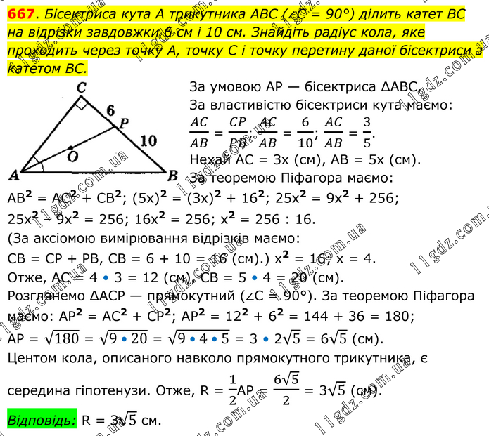 Бісектриса кута А трикутника ABC (∠C = 90°) ділить катет BC на відрізки завдовжки 6 см і 10 см. Знайдіть радіус кола, яке проходить через точку А, точку C і точку перетину даної бісектриси з катетом BC. За умовою АР — бісектриса ∆АВС. За властивістю бісектриси кута маємо: AC/AB = CP/PB; AC/AB = 6/10; AC/AB = 3/5. Нехай АС = Зx (см), АВ = 5x (см). За теоремою Піфагора маємо: АВ2 = АС2 + СВ2; (5x)2 = (Зx)2 + 162; 25x2 = 9x2 + 256; 25х2 – 9х2 = 256; 16x2 = 256; x2 = 256 : 16. (За аксіомою вимірювання відрізків маємо: СВ = СР + РВ, СВ = 6 + 10 = 16 (см).) x2 = 16; x = 4. Отже, АС = 4 • 3 = 12 (см), СВ = 5 • 4 = 20 (см). Розглянемо ∆АСР — прямокутний (∠С = 90°). За теоремою Піфагора маємо: АР2 = АС2 + СР2; АР2 = 122 + 62 = 144 + 36 = 180; АР = √180 = √(9•20) = √(9•4•5) = 3 • 2√5 = 6√5 (см). Центом кола, описаного навколо прямокутного трикутника, є середина гіпотенузи. Отже, R = 1/2АР = (6√5)/2 = 3√5 (см). Відповідь: R = З√5 см.