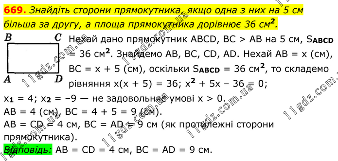 Знайдіть сторони прямокутника, якщо одна з них на 5 см більша за другу, а площа прямокутника дорівнює 36 см2. Нехай дано прямокутник АВСD, ВС > АВ на 5 см, SABCD = 36 см2. Знайдемо АВ, ВС, СD, АD. Нехай АВ = х (см), ВС = х + 5 (см), оскільки SABCD = 36 см2, то складемо рівняння х(х + 5) = 36; х2 + 5х – 36 = 0; х1 = 4; х2 = –9 — не задовольняє умові х > 0. АВ = 4 (см), ВС = 4 + 5 = 9 (см). АВ = СD = 4 см, ВС = АD = 9 см (як протилежні сторони прямокутника). Відповідь: АВ = СD = 4 см, ВС = АD = 9 см.
