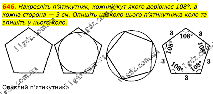 Накресліть п’ятикутник, кожний кут якого дорівнює 108°, а кожна сторона — 3 см. Опишіть навколо цього п’ятикутника коло та впишіть у нього коло. Опуклий п’ятикутник.