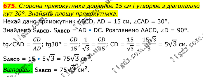 Сторона прямокутника дорівнює 15 см і утворює з діагоналлю кут 30°. Знайдіть площу прямокутника. Нехай дано прямокутник ABCD, AD = 15 cм, ∠CAD = 30°. Знайдемо SABCD. SABCD = AD • DC. Розглянемо ∆ACD, ∠D = 90°. tg∠CAD = CD/AD; tg30° = CD/15; 1/√3 = CD/15; CD = 15/√3 = (15√3)/3 = 5√3 см. SABCD = 15 • 5√3 = 75√3 см2. Відповідь: SABCD = 75√3 см2.