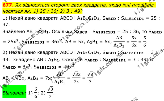 Як відносяться сторони двох квадратів, якщо їхні площі від носяться як: 1) 25 : 36; 2) 3 : 49? 1) Нехай дано квадрати ABCD і A1B1C1D1, SABCD : SA1B1C1D1 = 25 : 37. Знайдемо AB : A1B1. Оскільки SABCD : SA1B1C1D1 = 25 : 36, тo SABCD = 25x2, SA1B1C1D1 = 36х2. AB = 5x, A1B1 = 6x; АВ/(А_1 В_1 ) = 5х/6х = 5/6. 2) Нехай дано квадрати ABCD і A1B1C1D1, SABCD : SA1B1C1D1 = 3 : 49. Знайдемо АВ : A1B1. Оскільки SABCD : SA1B1C1D1 = 3 : 49, то SABCD = Зх2, SA1B1C1D1 = 49х2. АВ = √3х, A1B1 = 7х; АВ/(А_1 В_1 ) = (√3 х)/7х = √3/7. Відповідь: 1) 5/6; 2) √3/7.