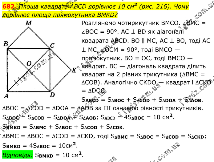 Площа квадрата ABCD дорівнює 10 см2 (рис. 216). Чому дорівнює площа прямокутника BMKD? Розглянемо чотирикутник ВМСО. ∠ВМС = ∠ВОС = 90°. АС ⊥ ВD як діагоналі квадрата АВСD. ВО ∥ МС, АС ⊥ ВО, тоді АС ⊥ МС, ∠ОСМ = 90°, тоді ВМСО — прямокутник, ВО = ОС, тоді ВМСО — квадрат. ВС — діагональ квадрата ділить квадрат на 2 рівних трикутника (∆ВМС = ∆СОВ). Аналогічно СКDО — квадрат і ∆СКD = ∆DОС. SABCD = S∆BOC + S∆COD + S∆DOA + S∆AOB. ∆ВОС = ∆СОD = ∆DОА = ∆АОВ за III ознакою рівності трикутників. S∆BOC = S∆COD + S∆DOA + S∆AOB; SABCD = 4S∆BOC = 10 см2. SBMKD = S∆BMC + S∆BOC + S∆COD + S∆CDK. ∆ВMС = ∆BОC = ∆CОD = ∆CKD, тоді S∆BMC = S∆BOC = S∆COD = S∆CKD; SBMKD = 4S∆BOC = 10см2. Відповідь: SBMKD = 10 см2.