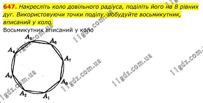 Накресліть коло довільного радіуса, поділіть його на 8 рівних дуг. Використовуючи точки поділу, побудуйте восьмикутник, вписаний у коло. Восьмикутник вписаний у коло