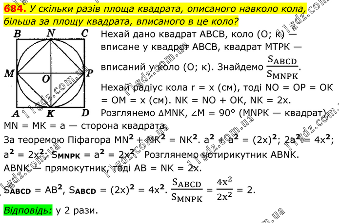 У скільки разів площа квадрата, описаного навколо кола, більша за площу квадрата, вписаного в це коло? Нехай дано квадрат АВСВ, коло (О; к) — вписане у квадрат АВСВ, квадрат МТРК — вписаний у коло (О; к). Знайдемо S_ABCD/S_MNPK . Нехай радіус кола r = х (см), тоді NO = ОР = ОК = ОМ = х (см). NК = NO + ОК, NК = 2х. Розглянемо ∆МNК, ∠М = 90° (МNРК — квадрат), МN = МК = а — сторона квадрата. За теоремою Піфагора МN2 + МК2 = NК2. а2 + а2 = (2x)2; 2a2 = 4x2; a2 = 2х2; SMNPK = a2 = 2x2. Розглянемо чотирикутник ABNK. ABNK — прямокутник, тоді AB = NK = 2х. SABCD = AB2, SABCD = (2x)2 = 4x2. S_ABCD/S_MNPK = 〖4x〗^2/〖2x〗^2 = 2. Відповідь: у 2 рази.