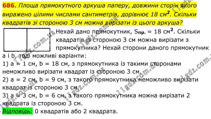 Площа прямокутного аркуша паперу, довжини сторін якого виражено цілими числами сантиметрів, дорівнює 18 см2. Скільки квадратів зі стороною 3 см можна вирізати із цього аркуша? Нехай дано прямокутник, Sпр. = 18 см2. Скільки квадратів із стороною З см можна вирізати з прямокутника? Нехай сторони даного прямокутник а і b, тоді можливі варіанти: 1) а = 1 см, b = 18 см, з прямокутника із такими сторонами неможливо вирізати квадрат із стороною 3 см. 2) а = 2 см, b = 9 см, з такого прямокутника неможливо вирізати квадрат із стороною 3 см. 3) а = 3 см, b = 6 см, з такого прямокутника можна вирізати 2 квадрата із стороною 3 см. Відповідь: 0 квадратів або 2 квадрата.
