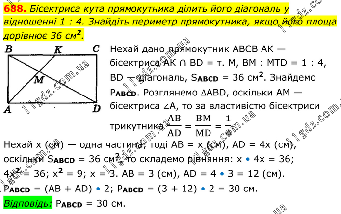 Бісектриса кута прямокутника ділить його діагональ у відношенні 1 : 4. Знайдіть периметр прямокутника, якщо його площа дорівнює 36 см2. Нехай дано прямокутник АВСВ АК — бісектриса АК ∩ ВD = т. М, ВМ : МТD = 1 : 4, ВD — діагональ, SАВСD = 36 см2. Знайдемо РАВСD. Розглянемо ∆АВD, оскільки АМ — бісектриса ∠А, то за властивістю бісектриси трикутника AB/AD = BM/MD = 1/4. Нехай х (см) — одна частина, тоді АВ = х (см), АD = 4х (см), оскільки SABCD = 36 см2, то складемо рівняння: х • 4х = 36; 4x2 = 36; х2 = 9; х = 3. АВ = 3 (см), АD = 4 • З = 12 (см). РАВСD = (АВ + АD) • 2; РABCD = (3 + 12) • 2 = 30 см. Відповідь: РABCD = 30 см.
