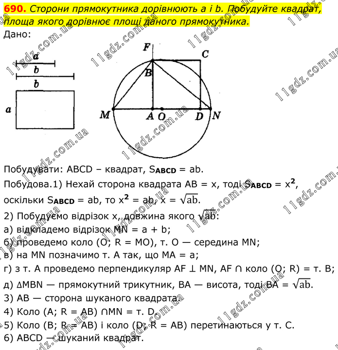 Сторони прямокутника дорівнюють а і b. Побудуйте квадрат, площа якого дорівнює площі даного прямокутника. Дано: Побудувати: АВСD – квадрат, SABCD = ab. Побудова.1) Нехай сторона квадрата АВ = х, тоді SABCD = x2, оскільки SABCD = аb, то x2 = аb, х = √ab. 2) Побудуємо відрізок х, довжина якого √ab: а) відкладемо відрізок МN = а + b; б) проведемо коло (О; R = МО), т. О — середина МN; в) на МN позначимо т. А так, що МА = а; г) з т. А проведемо перпендикуляр АF ⊥ МN, АF ∩ коло (О; R) = т. В; д) ∆МВN — прямокутний трикутник, ВА — висота, тоді ВА = √ab. 3) АВ — сторона шуканого квадрата. 4) Коло (А; R = АВ) ∩MN = т. D. 5) Коло (В; R = АВ) і коло (D; R = АВ) перетинаються у т. С. 6) АВСD — шуканий квадрат.