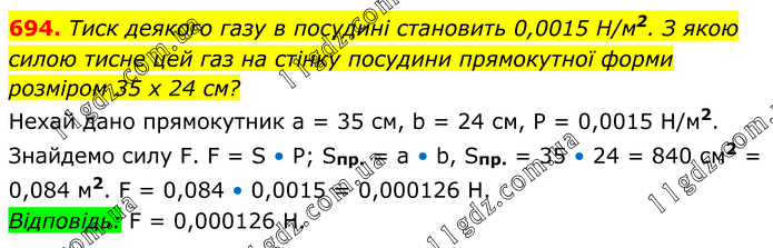 Тиск деякого газу в посудині становить 0,0015 Н/м2. З якою силою тисне цей газ на стінку посудини прямокутної форми розміром 35 х 24 см? Нехай дано прямокутник а = 35 cм, b = 24 см, Р = 0,0015 Н/м2. Знайдемо силу F. F = S • Р; Sпр. = а • b, Sпр. = 35 • 24 = 840 см2 = 0,084 м2. F = 0,084 • 0,0015 = 0,000126 Н. Відповідь: F = 0,000126 Н.