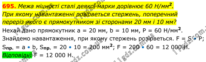 Межа міцності сталі деякої марки дорівнює 60 Н/мм2. При якому навантаженні розірветься стержень, поперечний переріз якого є прямокутником зі сторонами 20 мм і 10 мм? Нехай дано прямокутник а = 20 мм, b = 10 мм, Р = 60 Н/мм2. Знайдемо навантаження, при якому стержень розірветься. F = S • Р; Sпр. = а • b, Sпр. = 20 • 10 = 200 мм2; F = 200 • 60 = 12 000 Н. Відповідь: F = 12 000 Н.