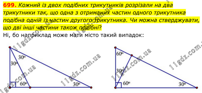 Кожний iз двох подiбних трикутникiв розрiзали на два трикутники так, що одна з отриманих частин одного трикутника подiбна однiй iз частин другого трикутника. Чи можна стверджувати, що двi iншi частини також подiбнi? Ні, бо наприклад може мати місто такий випадок: