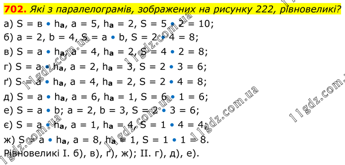Які з паралелограмів, зображених на рисунку 222, рівновеликі? а) S = в • hа, а = 5, ha = 2, S = 5 • 2 = 10; б) а = 2, b = 4, S = а • b, S = 2 • 4 = 8; в) S = а • ha, а = 4, ha = 2, S = 4 • 2 = 8; г) S = а • ha, a = 2, ha = 3, S = 2 • 3 = 6; ґ) S = а • ha, а = 4, ha = 2, S = 2 • 4 = 8; д) S = а • ha, а = 6, ha = 1, S = 6 • 1 = 6; е) S = а • b; а = 2, b = 3, S = 2 • 3 = 6; є) S = а • ha, а = 1, ha = 4, S = 1 • 4 = 4; ж) S = а • ha, а = 8, ha = 1, S = 1 • 1 = 8. Рівновеликі І. б), в), ґ), ж); II. г), д), е).
