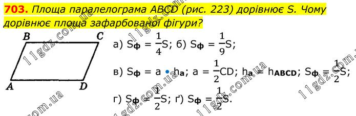Площа паралелограма ABCD (рис. 223) дорівнює S. Чому дорівнює площа зафарбованої фігури? a) Sф = 1/4S; б) Sф = 1/9S; в) Sф = a • ha; a = 1/2CD; ha = hABCD; Sф = 1/2S; г) Sф = 1/2S; ґ) Sф = 1/2S.