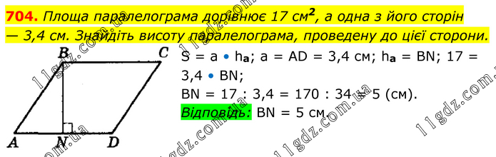 Площа паралелограма дорівнює 17 см2, а одна з його сторін — 3,4 см. Знайдіть висоту паралелограма, проведену до цієї сторони. S = а • ha; a = АD = 3,4 см; hа = ВN; 17 = 3,4 • ВN; ВN = 17 : 3,4 = 170 : 34 = 5 (см). Відповідь: ВN = 5 см.