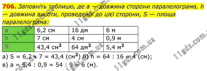 Заповніть таблицю, де а — довжина сторони паралелограма, h — довжина висоти, проведеної до цієї сторони, S — площа паралелограма: a 6,2 см 16 дм 6 м h 7 см 4 см 0,9 м S 43,4 см2 64 дм2 5,4 м2 а) S = 6,2 • 7 = 43,4 (см2) б) h = 64 : 16 = 4 (см); в) а = 5,4 : 0,9 = 54 : 9 = 6 (м).
