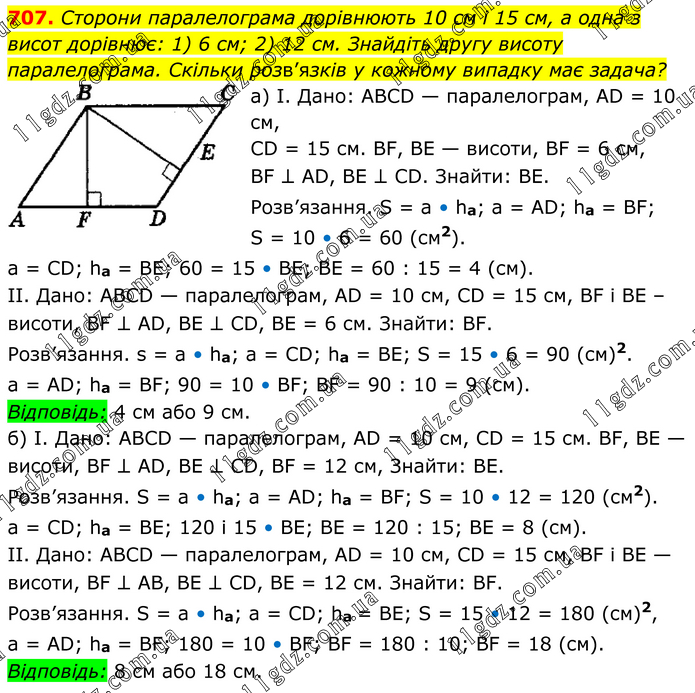 Сторони паралелограма дорівнюють 10 см і 15 см, а одна з висот дорівнює: 1) 6 см; 2) 12 см. Знайдіть другу висоту паралелограма. Скільки розв’язків у кожному випадку має задача? а) I. Дано: АВСD — паралелограм, АD = 10 см, СD = 15 см. ВF, ВЕ — висоти, ВF = 6 см, ВF ⊥ АD, ВЕ ⊥ СD. Знайти: ВЕ. Розв’язання. S = а • ha; а = АD; ha = ВF; S = 10 • 6 = 60 (см2). а = СD; ha = ВЕ; 60 = 15 • ВЕ; ВЕ = 60 : 15 = 4 (см). II. Дано: АВСD — паралелограм, АD = 10 см, СD = 15 см, BF i BE – висоти, ВF ⊥ АD, ВЕ ⊥ СD, ВE = 6 см. Знайти: ВF. Розв’язання. s = а • hа; а = СD; ha = ВЕ; S = 15 • 6 = 90 (см)2. а = АD; hа = ВF; 90 = 10 • ВF; ВF = 90 : 10 = 9 (см). Відповідь: 4 см або 9 см. б) I. Дано: АВСD — паралелограм, АD = 10 см, СD = 15 см. ВF, ВЕ — висоти, ВF ⊥ АD, ВE ⊥ СD, ВF = 12 см, Знайти: ВЕ. Розв’язання. S = а • hа; а = АD; ha = ВF; S = 10 • 12 = 120 (см2). а = СD; hа = ВE; 120 і 15 • ВЕ; ВЕ = 120 : 15; ВЕ = 8 (см). II. Дано: АВСD — паралелограм, АD = 10 см, СD = 15 см, ВF і ВЕ — висоти, ВF ⊥ АВ, ВЕ ⊥ СD, ВЕ = 12 см. Знайти: ВF. Розв’язання. S = а • ha; а = СD; ha = ВE; S = 15 • 12 = 180 (см)2, а = АD; hа = ВF; 180 = 10 • ВF; ВF = 180 : 10; ВF = 18 (см). Відповідь: 8 см або 18 см.