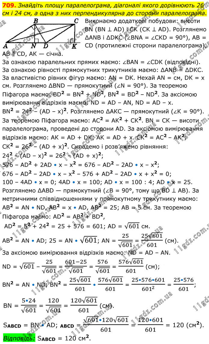 Знайдіть площу паралелограма, діагоналі якого дорівнюють 26 см і 24 см, а одна з них перпендикулярна до сторони паралелограма. Виконаємо додаткові побудови: висоти ВN (ВN ⊥ АD) і СK (CK ⊥ АD). Розглянемо ∆АNВ і ∆DKС (∠ВNА = ∠СKD = 90°), АВ = СD (протилежні сторони паралелограма), АВ ∥ СD, АК — січна. За ознакою паралельних прямих маємо: ∠ВАN = ∠СDК (відповідні). За ознакою рівності прямокутних трикутників маємо: ∆АNВ = ∆DКС. За властивістю рівних фігур маємо: АN = DК. Нехай АN = см, DК = x см. Розглянемо ∆ВND — прямокутний (∠N = 90°). За теоремою Піфагора маємо: ВD2 = ВN2 + ND2, ВN2 = ВD2 – ND2. За аксіомою вимірювання відрізків маємо: ND = АD – АN, ND = АD – х. ВN2 = 242 – (АD – х)2. Розглянемо ∆АКС — прямокутний (∠К = 90°). За теоремою Піфагора маємо: АС2 = АК2 + СК2. ВN = СК — висоти паралелограма, проведені до сторони АD. За аксіомою вимірювання відрізків маємо: АК = АD + DК; АК = АD + х. СК2 = АС2 – АК2, СК2 = 262 – (АD + х)2. Складемо і розв’яжемо рівняння: 242 – (АD – х)2 = 262 – (АD + х)2; 576 – АD2 + 2АD • х – х2 = 676 – АD2 – 2АD • х – х2; 676 – AD2 – 2АD • х – x2 – 576 + AD2 – 2АD • x + x2 = 0; 100 – 4АD • x = 0; 4АD • x = 100; АD • х = 100 : 4; АD • х = 25. Розглянемо ∆АВD — прямокутний (∠В = 90°, тому що ВD ⊥ АВ). За метричними співвідношеннями у прямокутному трикутнику маємо: АВ2 = АN • ND, АВ2 = х • АD, АВ2 = 25; АВ = 5 см. За теоремою Піфагора маємо: АD2 = АВ2 + ВD2, АD2 = 52 + 242 = 25 + 576 = 601; АD = √601 см. АВ2 = АN • АD; 25 = АN • √601; АN = 25/√601 = (25√601)/601 (см). За аксіомою вимірювання відрізків маємо: ND = АD – АN. ND = √601 – 25/√601 = (601-25)/√601 = 576/√601 = (576√601)/601 (см); BN2 = AN • ND; BN2 = (25√601)/601 • (576√601)/601 = (25•576•601)/601^2 = (25•576)/601; BN = (5•24)/√601 = 120/√601 = (120√601)/601 (см). SABCD = BN • AD; ABCD = (√601•120√601)/601 = (120•601)/601 = 120 (см2). Відповідь: SABCD = 120 см2.
