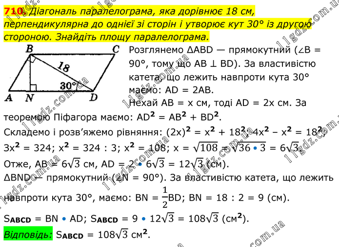 Діагональ паралелограма, яка дорівнює 18 см, перпендикулярна до однієї зі сторін і утворює кут 30° із другою стороною. Знайдіть площу паралелограма. Розглянемо ∆АВD — прямокутний (∠В = 90°, тому що АВ ⊥ ВD). За властивістю катета, що лежить навпроти кута 30° маємо: АD = 2АВ. Нехай АВ = x см, тоді АD = 2х см. За теоремою Піфагора маємо: АD2 = АВ2 + ВD2. Складемо і розв’яжемо рівняння: (2х)2 = х2 + 182; 4х2 – х2 = 182; Зх2 = 324; х2 = 324 : 3; х2 = 108; x = √108 = √(36•3) = 6√3. Отже, АВ = 6√3 см, АD = 2 • 6√3 = 12√3 (см). ∆ВND — прямокутний (∠N = 90°). За властивістю катета, що лежить навпроти кута 30°, маємо: ВN = 1/2ВD; ВN = 18 : 2 = 9 (см). SABCD = ВN • АD; SABCD = 9 • 12√3 = 108√3 (см2). Відповідь: SABCD = 108√3 см2.