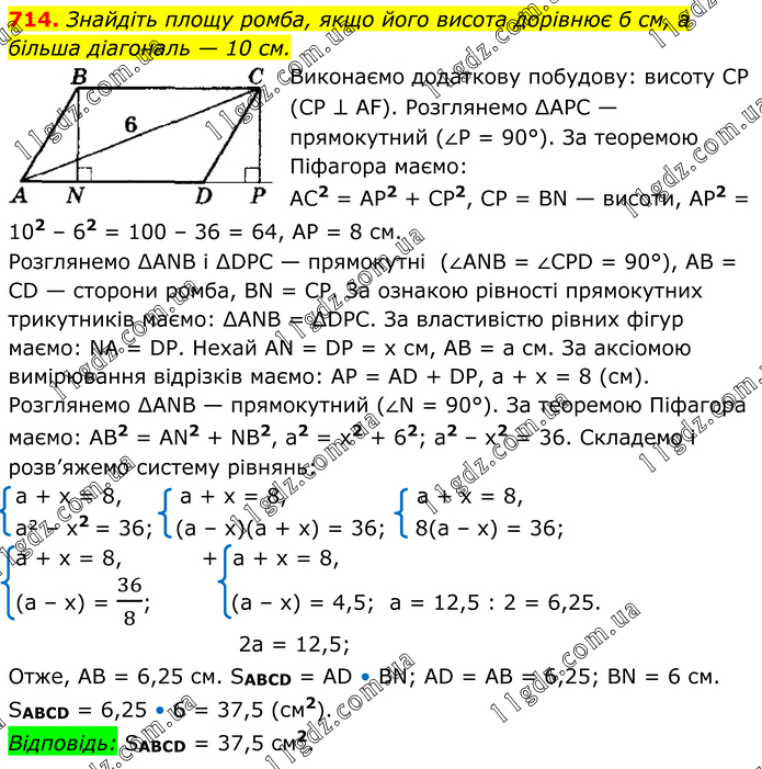 Знайдіть площу ромба, якщо його висота дорівнює б см, а більша діагональ — 10 см. Виконаємо додаткову побудову: висоту СР (СР ⊥ АF). Розглянемо ∆АРС — прямокутний (∠P = 90°). За теоремою Піфагора маємо: АС2 = АР2 + СР2, СР = ВN — висоти, АР2 = 102 – 62 = 100 – 36 = 64, АР = 8 см. Розглянемо ∆АNВ і ∆DРС — прямокутні (∠АNВ = ∠СРD = 90°), АВ = СD — сторони ромба, ВN = СР. За ознакою рівності прямокутних трикутників маємо: ∆АNВ = ∆DРС. За властивістю рівних фігур маємо: NА = DР. Нехай АN = DР = х см, АВ = а см. За аксіомою вимірювання відрізків маємо: АР = АD + DР, а + х = 8 (см). Розглянемо ∆АNВ — прямокутний (∠N = 90°). За теоремою Піфагора маємо: АВ2 = АN2 + NВ2, а2 = х2 + 62; а2 – х2 = 36. Складемо і розв’яжемо систему рівнянь: а + х = 8, а + х = 8, а + х = 8, а² – х2 = 36; (а – х)(a + x) = 36; 8(a – x) = 36; a + x = 8, + a + x = 8, (a – x) = 36/8; (a – x) = 4,5; a = 12,5 : 2 = 6,25. 2a = 12,5; Отже, АВ = 6,25 см. SABCD = АD • ВN; АD = АВ = 6,25; ВN = 6 см. SABCD = 6,25 • 6 = 37,5 (см2). Відповідь: SABCD = 37,5 см2.