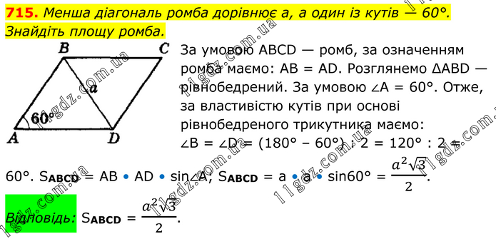 Менша діагональ ромба дорівнює а, а один із кутів — 60°. Знайдіть площу ромба. За умовою АВСD — ромб, за означенням ромба маємо: АВ = АD. Розглянемо ∆АВD — рівнобедрений. За умовою ∠A = 60°. Отже, за властивістю кутів при основі рівнобедреного трикутника маємо: ∠В = ∠D = (180° – 60°) : 2 = 120° : 2 = 60°. SABCD = AB • AD • sin∠A; SABCD = a • a • sin60° = (a^2 √3)/2. Відповідь: SABCD = (a^2 √3)/2.