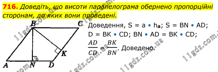 Доведіть, що висоти паралелограма обернено пропорційні сторонам, до яких вони проведені. Доведення, S = а • ha; S = ВN • АD; D = ВК • СD; ВN • AD = ВК • СD; AD/CD = BK/BN. Доведено.