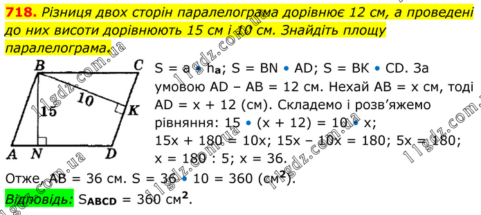 Різниця двох сторін паралелограма дорівнює 12 см, а проведені до них висоти дорівнюють 15 см і 10 см. Знайдіть площу паралелограма. S = а • ha; S = ВN • АD; S = ВК • СD. За умовою АD – АВ = 12 см. Нехай АВ = х см, тоді АD = x + 12 (см). Складемо і розв’яжемо рівняння: 15 • (х + 12) = 10 • x; 15x + 180 = 10x; 15x – 10x = 180; 5x = 180; x = 180 : 5; x = 36. Отже, АВ = 36 см. S = 36 • 10 = 360 (см2). Відповідь: SABCD = 360 см2.