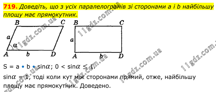 Доведіть, що з усіх паралелограмів зі сторонами a і b найбільшу площу має прямокутник. S = a • b • sinα; 0 < sinα ≤ 1. sinα = 1, тоді коли кут між сторонами прямий, отже, найбільшу площу має прямокутник. Доведено.