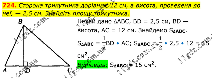 Сторона трикутника дорівнює 12 см, а висота, проведена до неї, — 2,5 см. Знайдіть площу трикутника. Нехай дано ∆АВС, ВD = 2,5 см, ВD — висота, АС = 12 см. Знайдемо S∆ABC. S∆ABC = 1/2BD • АС; S∆ABC = 1/2 • 2,5 • 12 = 15 см2. Відповідь: S∆ABC = 15 см2.