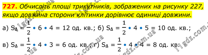 Обчисліть площі трикутників, зображених на рисунку 227, якщо довжина сторони клітинки дорівнює одиниці довжини. а) S∆ = 1/2 • 6 • 4 = 12 од. кв.; б) S∆ = 1/2 • 4 • 5 = 10 од. кв.; в) S∆ = 1/2 • 4 • 3 = 6 од. кв.; г) S∆ = 1/2 • 4 • 4 = 8 од. кв.