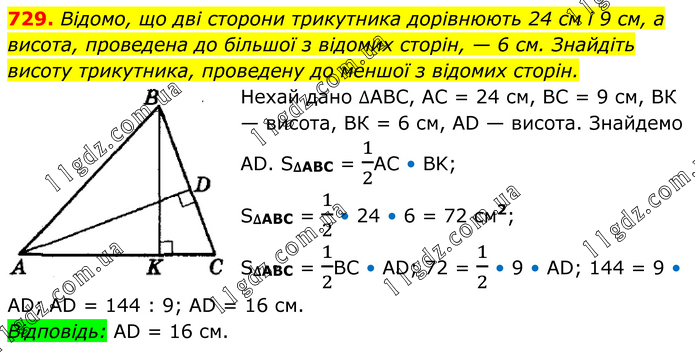 Відомо, що дві сторони трикутника дорівнюють 24 см і 9 см, а висота, проведена до більшої з відомих сторін, — 6 см. Знайдіть висоту трикутника, проведену до меншої з відомих сторін. Нехай дано ∆АВС, АС = 24 см, ВС = 9 см, ВК — висота, ВК = 6 см, АD — висота. Знайдемо АD. S∆ABC = 1/2АС • ВK; S∆ABC = 1/2 • 24 • 6 = 72 см2; S∆ABC = 1/2BС • AD; 72 = 1/2 • 9 • AD; 144 = 9 • АD; АD = 144 : 9; АD = 16 см. Відповідь: АD = 16 см.