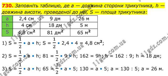 Заповніть таблицю, де а — довжина сторони трикутника, h — довжина висоти, проведеної до неї, S — площа трикутника: 1) S = 1/2 • а • h; S = 1/2 • 2,4 • 4 = 4,8 см2; 2) S = 1/2 • в • h; 81 = 1/2 • 9 • h; 162 = 9h; h = 162 : 9; h = 18 дм; 3) S = 1/2 • а • h; 65 = 1/2 • a • 5; 130 = а • 5; а = 130 : 5; а = 26 м.