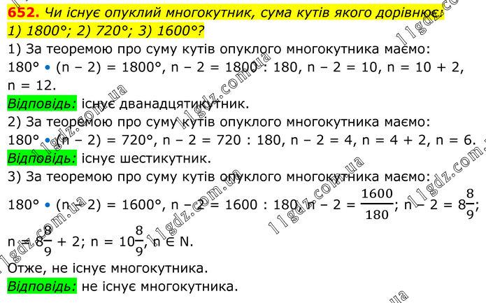 Чи існує опуклий многокутник, сума кутів якого дорівнює: 1) 1800°; 2) 720°; 3) 1600°? 1) За теоремою про суму кутів опуклого многокутника маємо: 180° • (n – 2) = 1800°, n – 2 = 1800 : 180, n – 2 = 10, n = 10 + 2, n = 12. Відповідь: існує дванадцятикутник. 2) За теоремою про суму кутів опуклого многокутника маємо: 180° • (n – 2) = 720°, n – 2 = 720 : 180, n – 2 = 4, n = 4 + 2, n = 6. Відповідь: існує шестикутник. 3) За теоремою про суму кутів опуклого многокутника маємо: 180° • (n – 2) = 1600°, n – 2 = 1600 : 180, n – 2 = 1600/180; n – 2 = 88/9; n = 88/9 + 2; n = 108/9, n ∈ N. Отже, не існує многокутника. Відповідь: не існує многокутника.