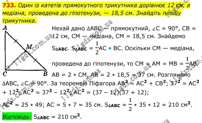 Один із катетів прямокутного трикутника дорівнює 12 см, а медіана, проведена до гіпотенузи, — 18,5 см. Знайдіть площу трикутника. Нехай дано ∆АВС — прямокутний, ∠С = 90°, СВ = 12 см, СМ — медіана, СМ = 18,5 см. Знайдемо S∆ABC. S∆ABC = 1/2АС • ВС. Оскільки СМ — медіана, проведена до гіпотенузи, то СМ = АМ = МВ = 1/2АВ. АВ = 2 • СМ, АВ = 2 • 18,5 = 37 см. Розглянемо ∆АВС, ∠С = 90°. За теоремою Піфагора АВ2 = АС2 + СВ2; 372 = АС2 + 122; АС2 = 372 – 122; АС2 = (37 – 12)(37 + 12); АС2 = 25 • 49; АС = 5 • 7 = 35 см. S∆ABC = 1/2 • 35 • 12 = 210 см2. Відповідь: S∆ABC = 210 см2.