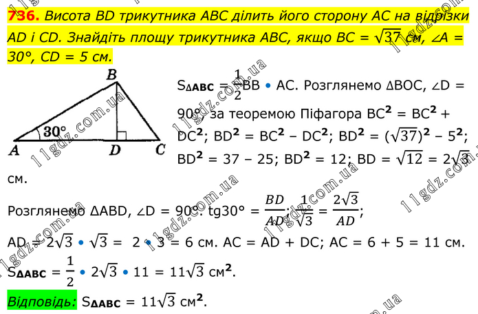 Висота BD трикутника ABC ділить його сторону AC на відрізки AD і CD. Знайдіть площу трикутника ABC, якщо BC = √37 см, ∠A = 30°, CD = 5 см. S∆ABC = 1/2ВВ • АС. Розглянемо ∆ВОС, ∠D = 90°, за теоремою Піфагора ВС2 = ВC2 + DС2; ВD2 = ВС2 – DС2; ВD2 = (√37)2 – 52; ВD2 = 37 – 25; ВD2 = 12; ВD = √12 = 2√3 см. Розглянемо ∆ABD, ∠D = 90°. tg30° = BD/AD; 1/√3 = (2√3)/AD; AD = 2√3 • √3 = 2 • 3 = 6 cм. AC = AD + DC; AC = 6 + 5 = 11 cм. S∆ABC = 1/2 • 2√3 • 11 = 11√3 см2. Відповідь: S∆ABC = 11√3 см2.