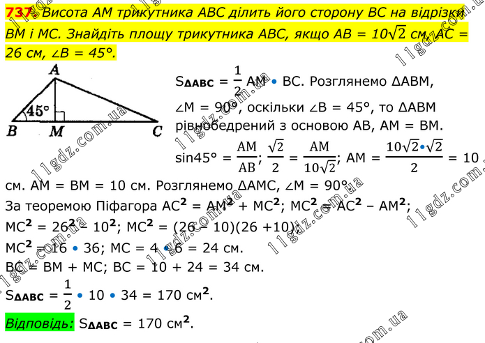 Висота AM трикутника ABC ділить його сторону BC на відрізки BM і MC. Знайдіть площу трикутника ABC, якщо AB = 10√2 см, AC = 26 см, ∠B = 45°. S∆ABC = 1/2 AM • ВС. Розглянемо ∆ABM, ∠M = 90°, оскільки ∠B = 45°, то ∆АВМ рівнобедрений з основою АВ, AM = ВМ. sin45° = АМ/АВ; √2/2 = АМ/(10√2); АМ = (10√2•√2)/2 = 10 см. AM = ВМ = 10 см. Розглянемо ∆АМС, ∠M = 90°. За теоремою Піфагора AC2 = AM2 + МС2; МС2 = АС2 – AM2; МС2 = 262 – 102; МС2 = (26 – 10)(26 +10); МС2 = 16 • 36; МС = 4 • 6 = 24 см. ВС = ВМ + МС; ВС = 10 + 24 = 34 см. S∆ABC = 1/2 • 10 • 34 = 170 см2. Відповідь: S∆ABC = 170 см2.