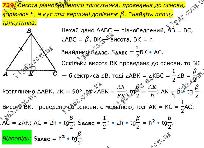 Висота рівнобедреного трикутника, проведена до основи, дорівнює h, а кут при вершині дорівнює β. Знайдіть площу трикутника. Нехай дано ∆АВС — рівнобедрений, АВ = ВС, ∠ABC = β, ВК — висота, ВК = h. Знайдемо S∆ABC. S∆ABC = 1/2ВК • АС. Оскільки висота ВК проведена до основи, то ВК — бісектриса ∠B, тоді ∠ABK = ∠KBC = 1/2∠B = β/2. Розглянемо ∆АВК, ∠K = 90°. tg ∠ABK = AK/BK; tgβ/2 = AK/h; АК = h • tg β/2. Висота ВК, проведена до основи, є медіаною, тоді АК = КС = 1/2АС; АС = 2АК; AC = 2h • tgβ/2; S∆ABC = 1/2h • 2h • tgβ/2 = h2 • tgβ/2. Відповідь: S∆ABC = h2 • tgβ/2.