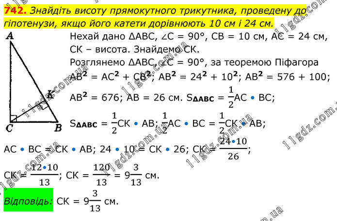 Знайдіть висоту прямокутного трикутника, проведену до гіпотенузи, якщо його катети дорівнюють 10 см і 24 см. Нехай дано ∆АВС, ∠С = 90°, СВ = 10 см, АС = 24 см, СК – висота. Знайдемо СК. Розглянемо ∆АВС, ∠С = 90°, за теоремою Піфагора АВ2 = АС2 + СВ2; АВ2 = 242 + 102; АВ2 = 576 + 100; АВ2 = 676; АВ = 26 см. S∆ABC = 1/2АС • ВС; S∆ABC = 1/2СК • АВ; 1/2АС • ВС = 1/2СК • АВ; АС • ВС = СК • АВ; 24 • 10 = СК • 26; СК = (24•10)/26; СК = (12•10)/13; СК = 120/13 = 93/13 см. Відповідь: СК = 93/13 см.